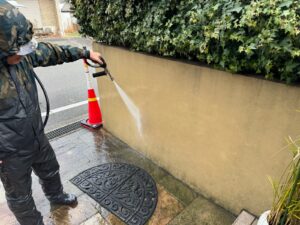 外壁表面を高圧洗浄でしっかりと洗浄し、汚れやカビ、苔などを落とします。これによって塗料をしっかりと密着させます。